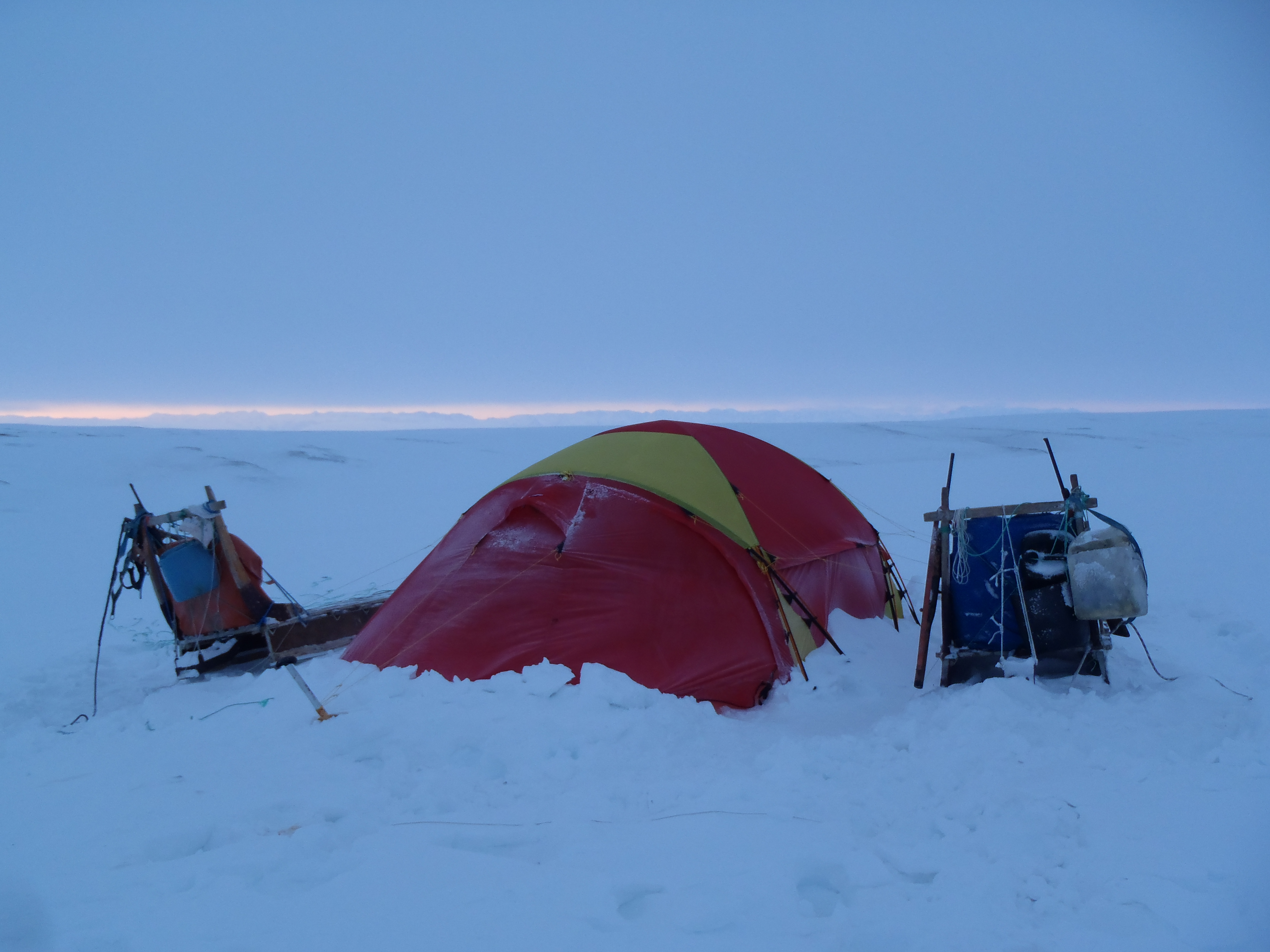 Camping at a beautiful spot after a long day in deep snow on the sea-ice north of Apaalardaai