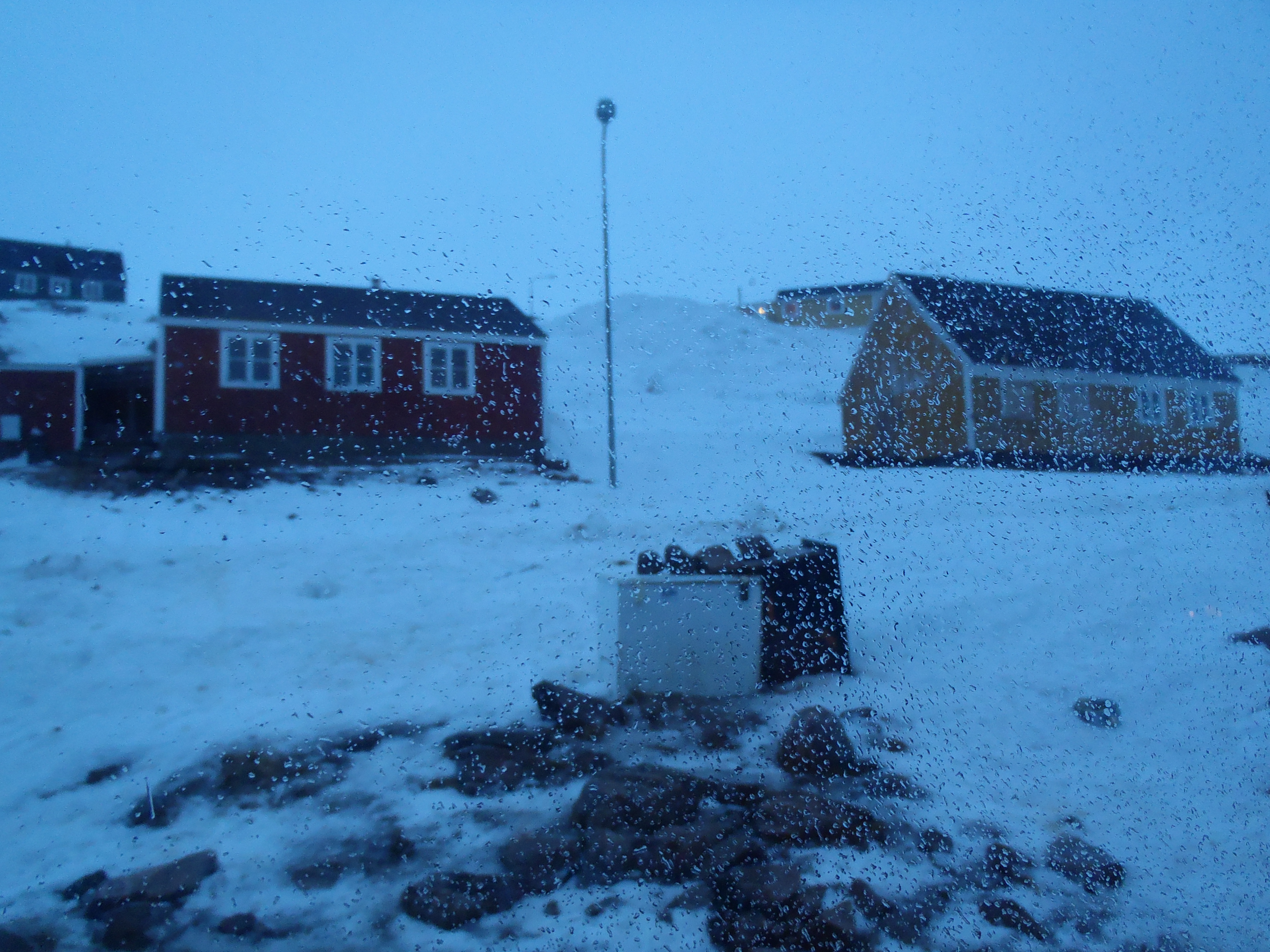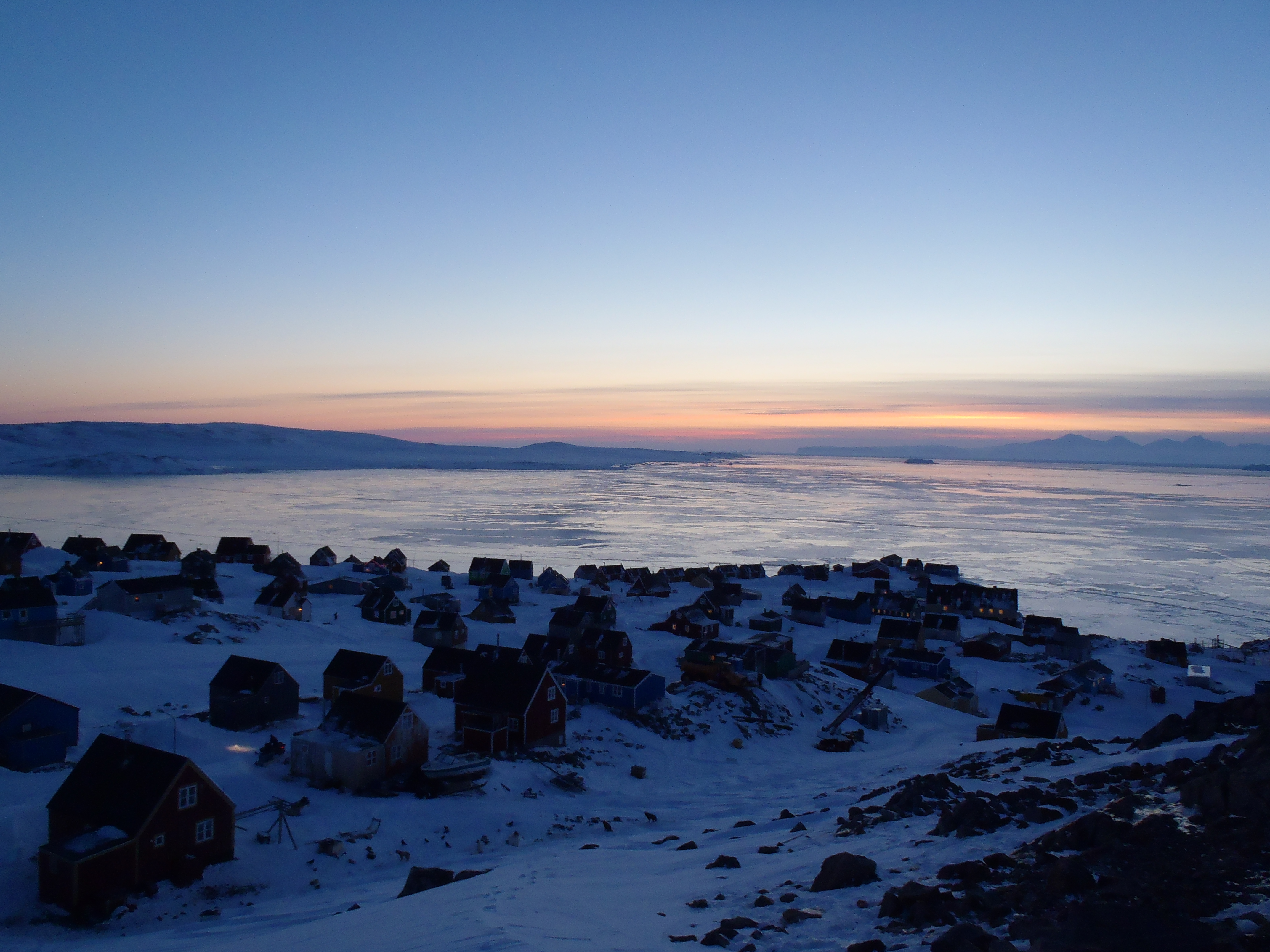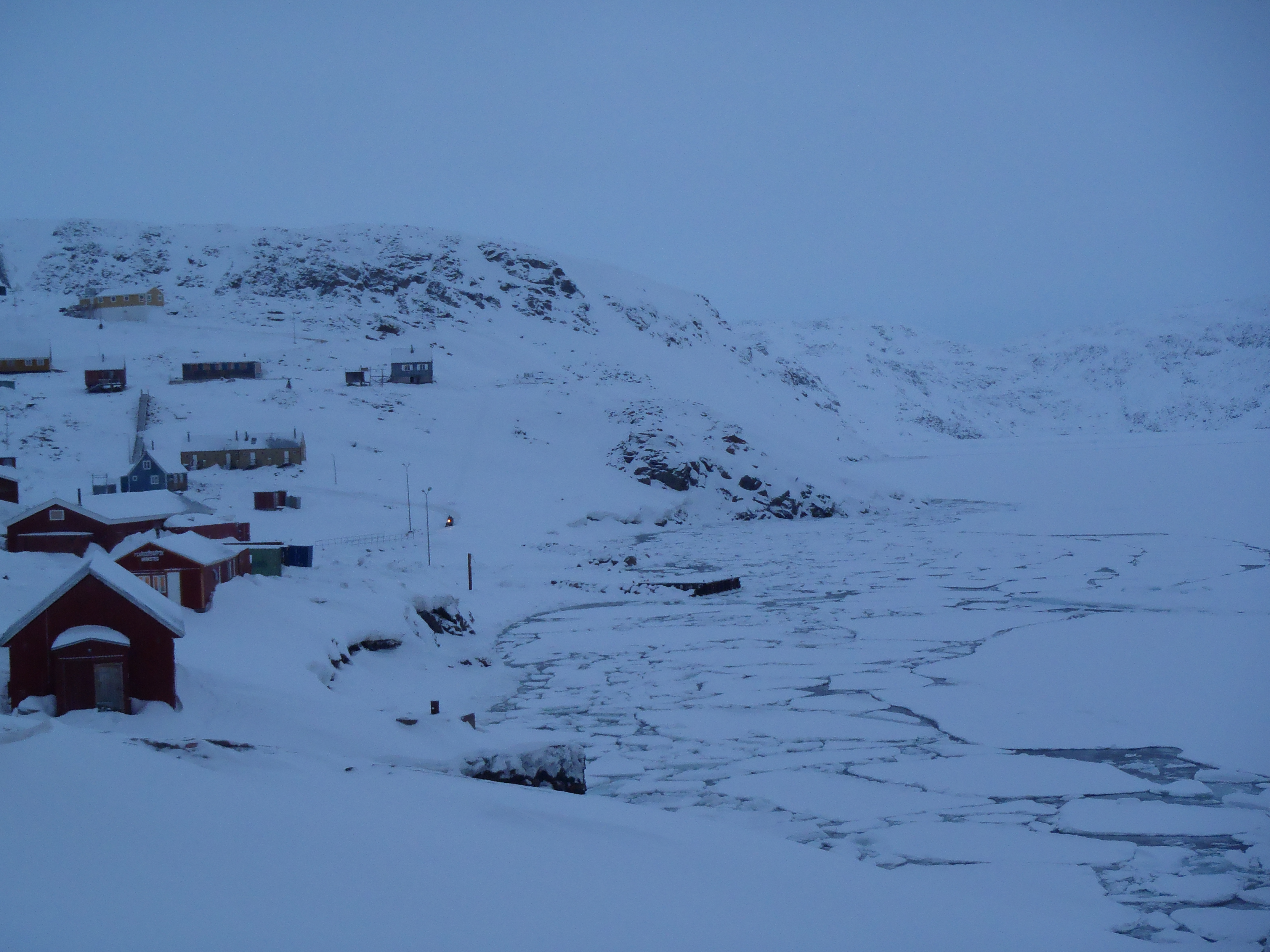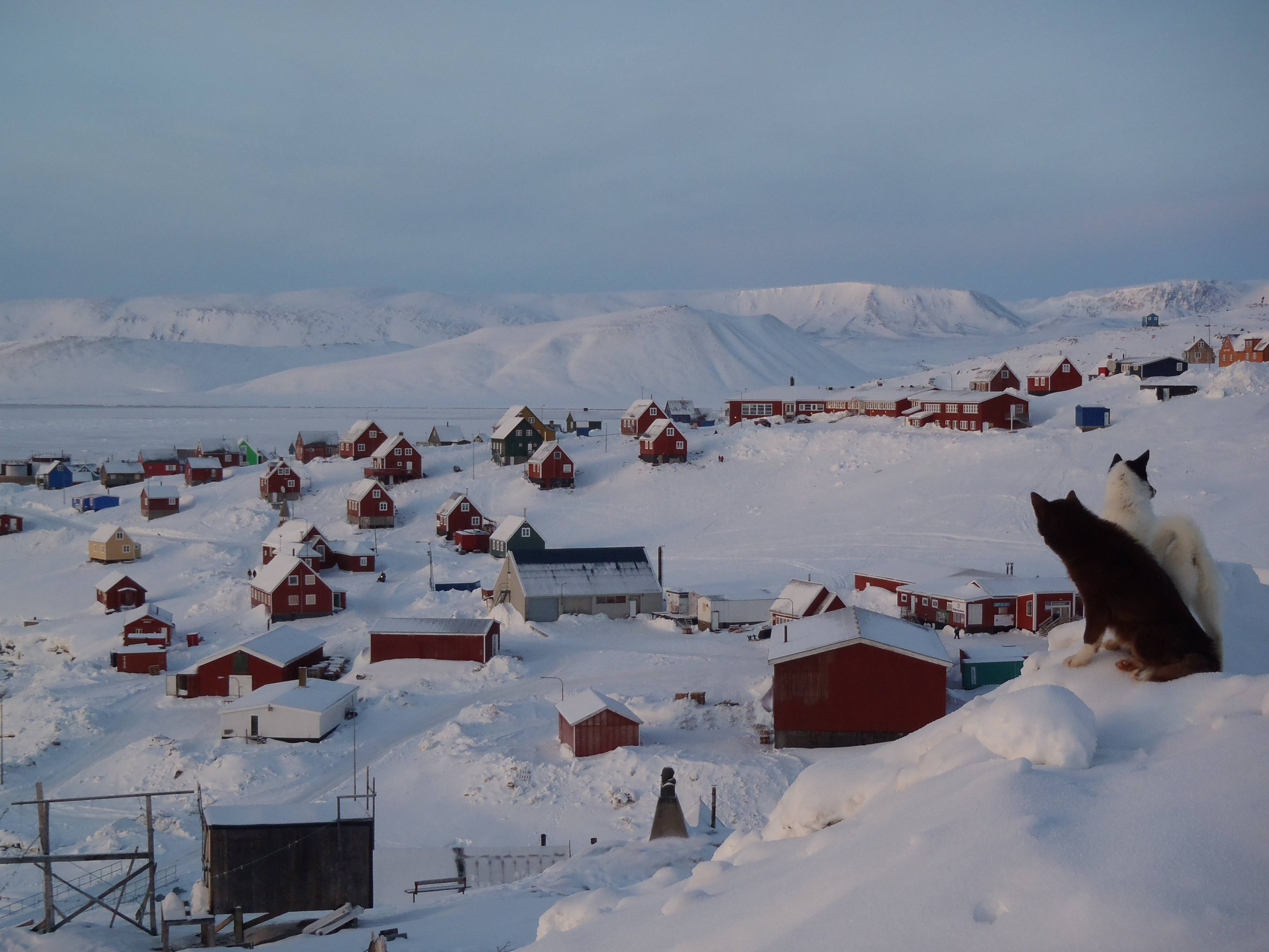 … looking down at the center of Ittoqqortoormiit, with some of our puppies.