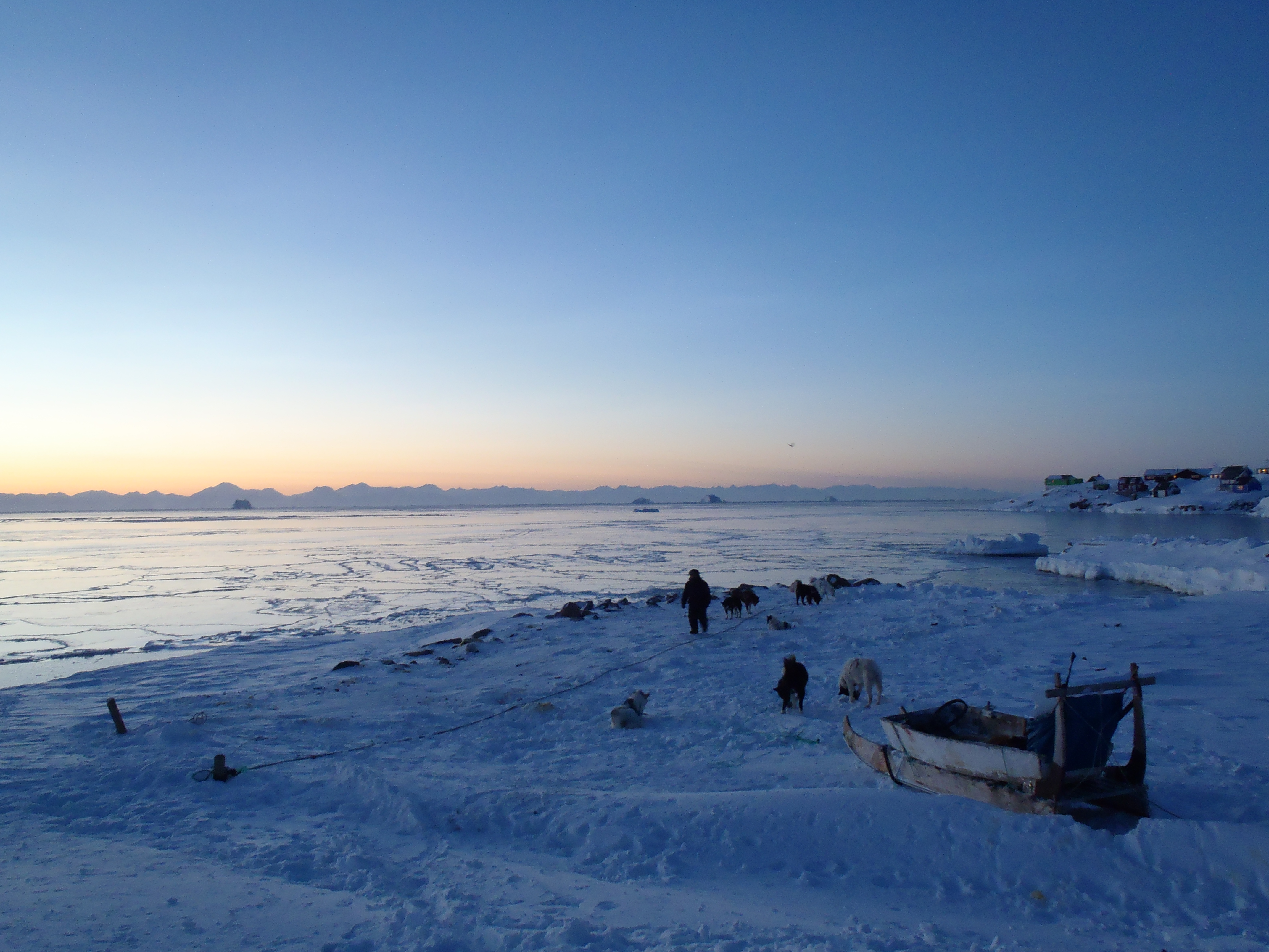 Yesterday, Ingkasi went out with his dogs for the first time this year, sledding through the hills behind of Ittoqqortoormiit and across Amdrup Havn. This picture was taken in the early afternoon, when he had just returned.