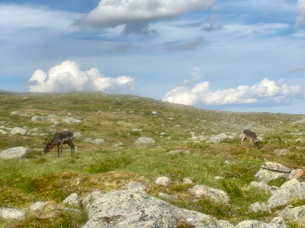 Before walking down into the woods I drank water from a small lake. A reindeer mother with her youngster walked by, it turned out I was resting at their water source!